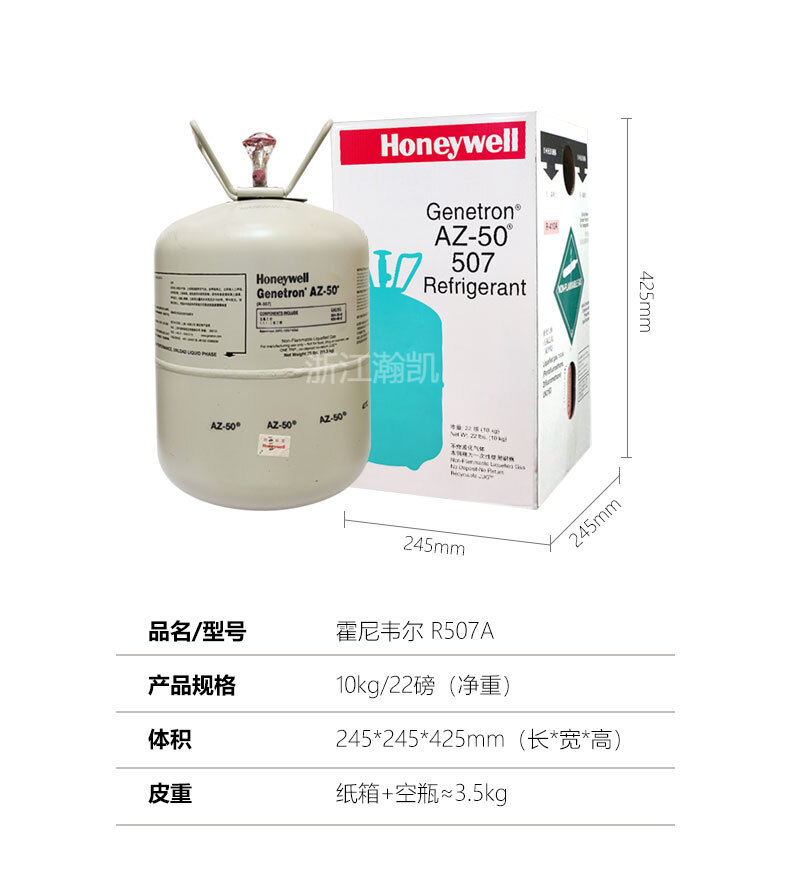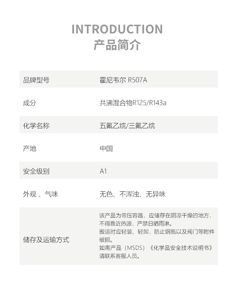 霍尼韋爾R-507制冷劑,別名R507,商品名稱有Genetron AZ-50、Genetron 507、SUVA 507等。廣泛用于新冷凍設(shè)備上的初裝和維修過程中的再添加。