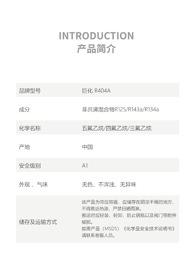R-404A制冷劑,別名R404A,商品名稱有SUVA HP62、SUVA 404A、Genetron 404A等。由于R-404A屬于HFC型非共沸環(huán)保制冷劑(完全不含破壞臭氧層的CFC、HCFC),得到目前絕大多數(shù)國家的認(rèn)可并推薦的低溫環(huán)保制冷劑,廣泛用于新冷凍設(shè)備上的初裝和維修過程中的再添加。符合美國環(huán)保組織EPA、SNAP和UL的標(biāo)準(zhǔn),符合美國采暖、制冷空調(diào)工程師協(xié)會(huì)(ASHRAE)的A1安全等級(jí)類別(對(duì)人身體無害)。